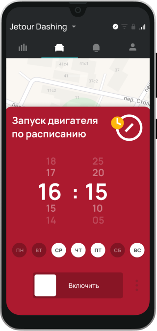 Удаленный запуск двигателя, управление системой подогрева* на любом расстоянии сделают поездку комфортной с первых минут. Система доступна для всех моделей Jetour.