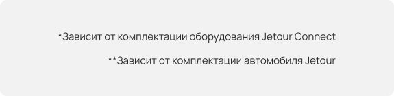 2 «Jetour Connect» — мониторинговая телематическая система для управления функциями автомобиля Jetour. Можно управлять центральным замком из любой точки мира с помощью мобильного приложения, находить автомобиль на парковке и отслеживать местоположение в реальном времени. Встроенная энергонезависимая память сохраняет информацию с датчиков устройства даже при отсутствии GSM сигнала. Управление центральным замком из любой точки мира с помощью мобильного приложения и интеллектуальная настройка дистанционного запуска двигателя автомобиля (по расписанию, температуре и заряду АКБ) поможет организовать уникальные сценарии использования. Jetour Connect предоставляет круглосуточную техническую поддержку для клиентов.