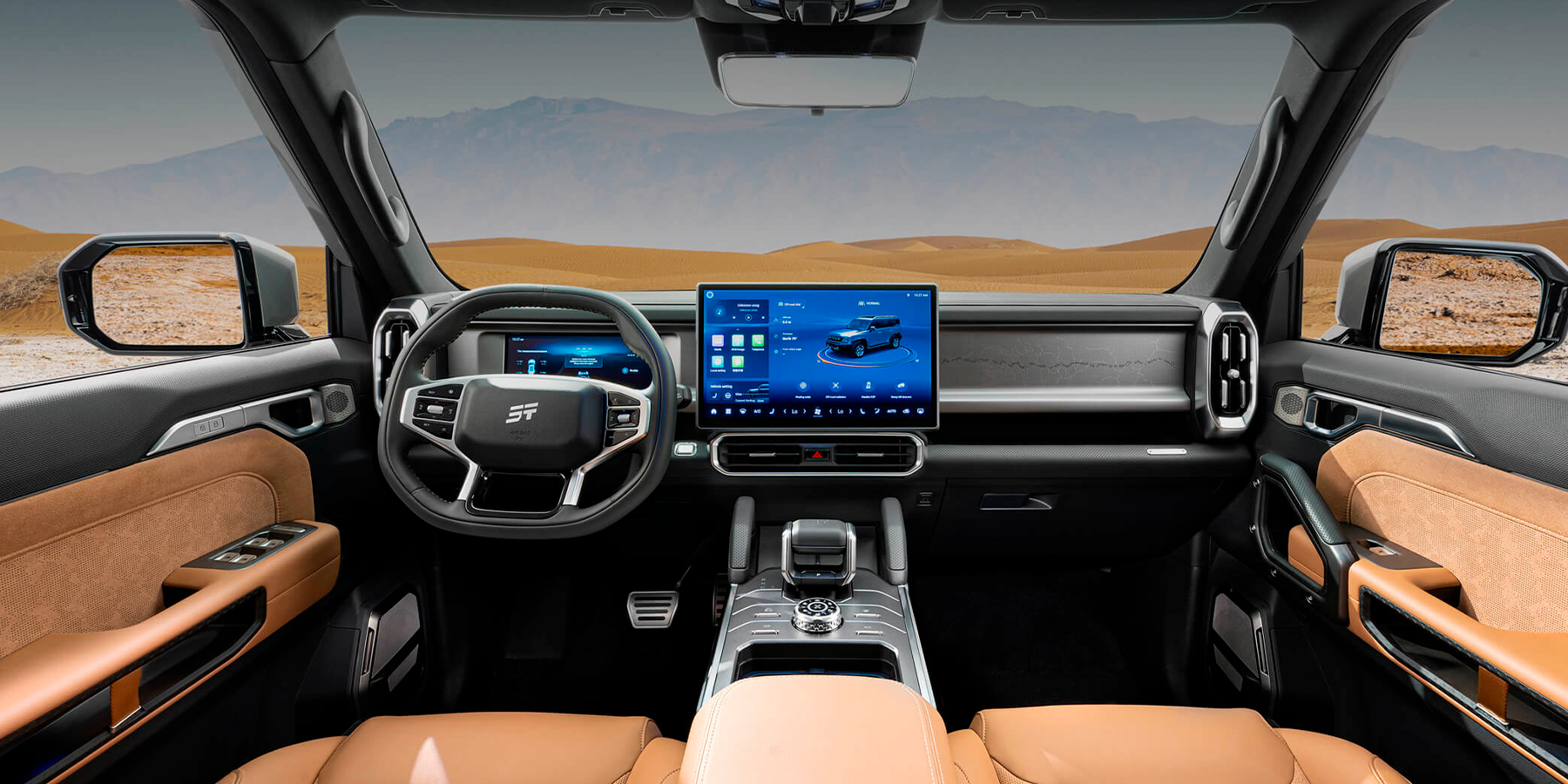 Внедорожные возможности T2 гарантированы за счет высокой геометрической проходимости: углы въезда и съезда составляют 28°. Минимальный дорожный просвет – 220 мм. Автомобиль способен преодолевать брод глубиной до 700 мм. Водителю предлагается выбор из 7 режимов вождения в любых дорожных условиях, включая сложные и высокие участки дороги.