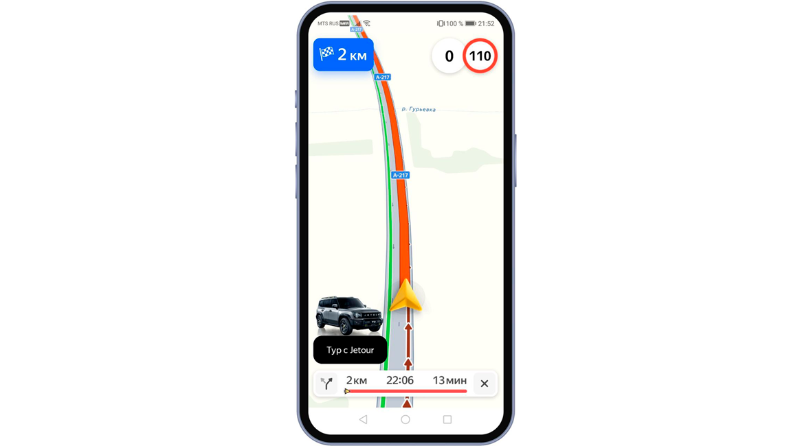 На главном экране Яндекс Навигатора можно увидеть кнопку для перехода на сайт проекта «Тур с Jetour». Здесь опубликованы полезные советы по путешествиям в различных регионах страны. Также пользователи сервиса могут установить в качестве курсора изображение новейшего внедорожника Jetour T2. Помимо этого на веб-версии Яндекс Карт есть промо-кнопка, а в пробке пользователи могут увидеть брендированный баннер Jetour.